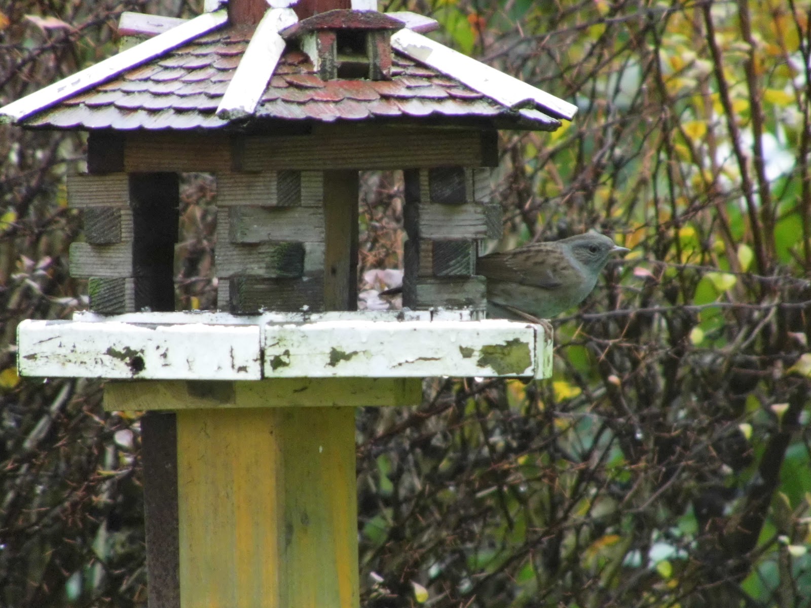 Leider werden oft die Vögel vergessen, die ihr Futter lieber am Boden als in luftiger Höhe suchen. Dazu zählen zum Beispeil Amseln und Heckenbraunellen. Ich habe mir angewöhnt, immer zwei, drei Scheppen Futter auf den Rasen neben das Futterhaus zu streuen – und wurde dafür mit dem Besuch zahlreicher gefiederten Freunde belohnt, die sich ins Haus nur selten verirren.